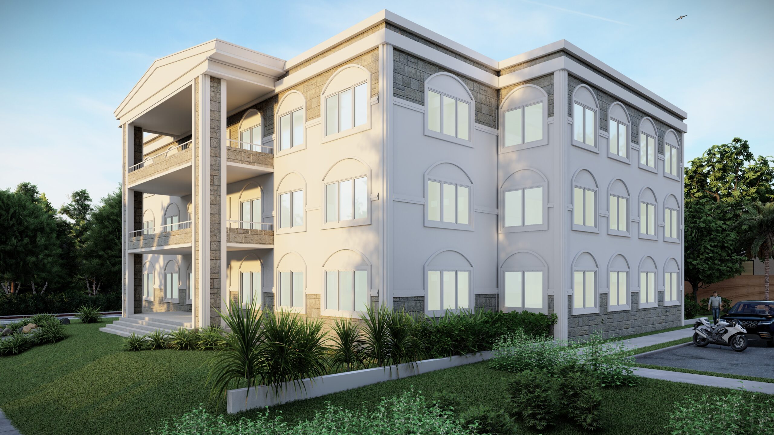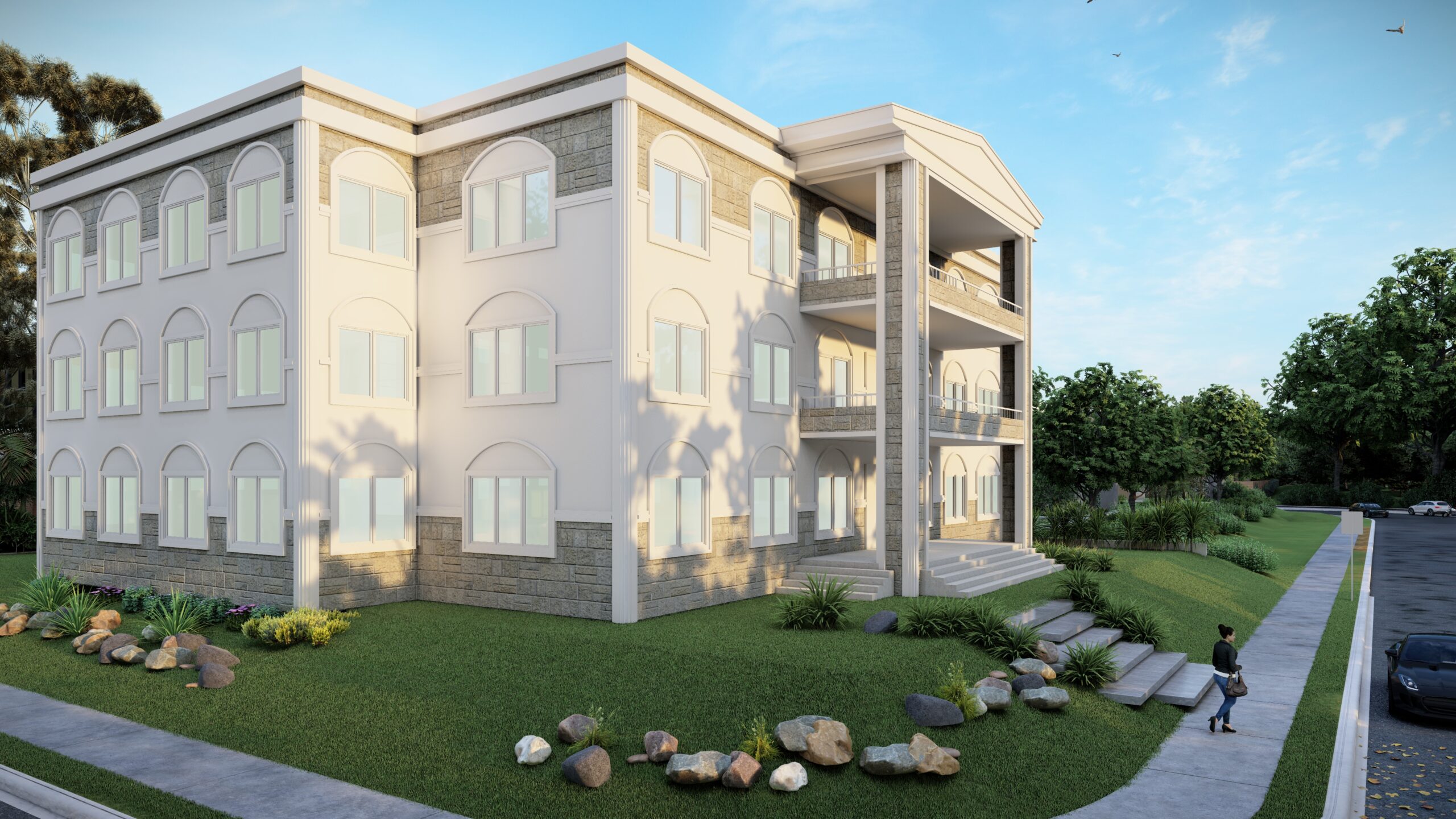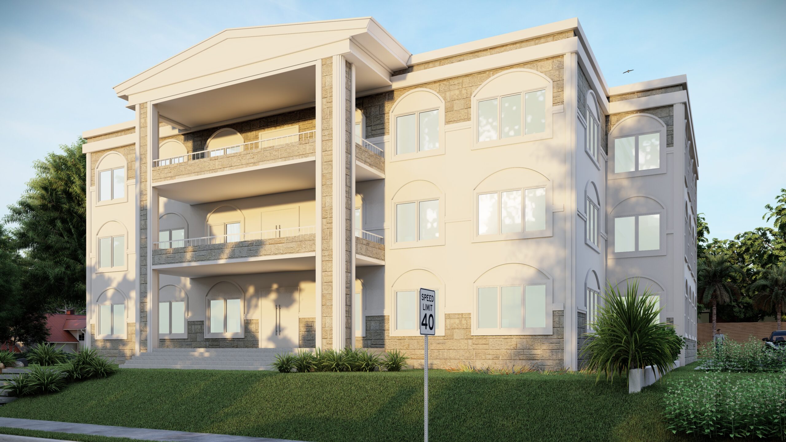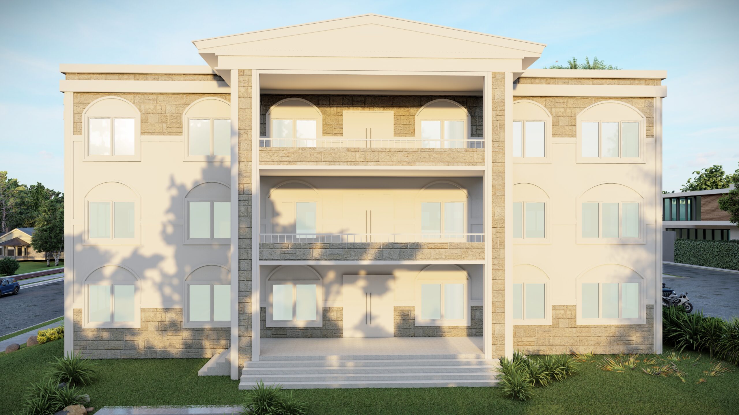 This neoclassical-inspired design for the Civil & Hydro “Block” at Council For Technical Education & Vocational Training Rapti Technical School Gobardiya-Dang, Nepal features a stately stone facade and ornamental details that give it an institutional, scholarly aesthetic.