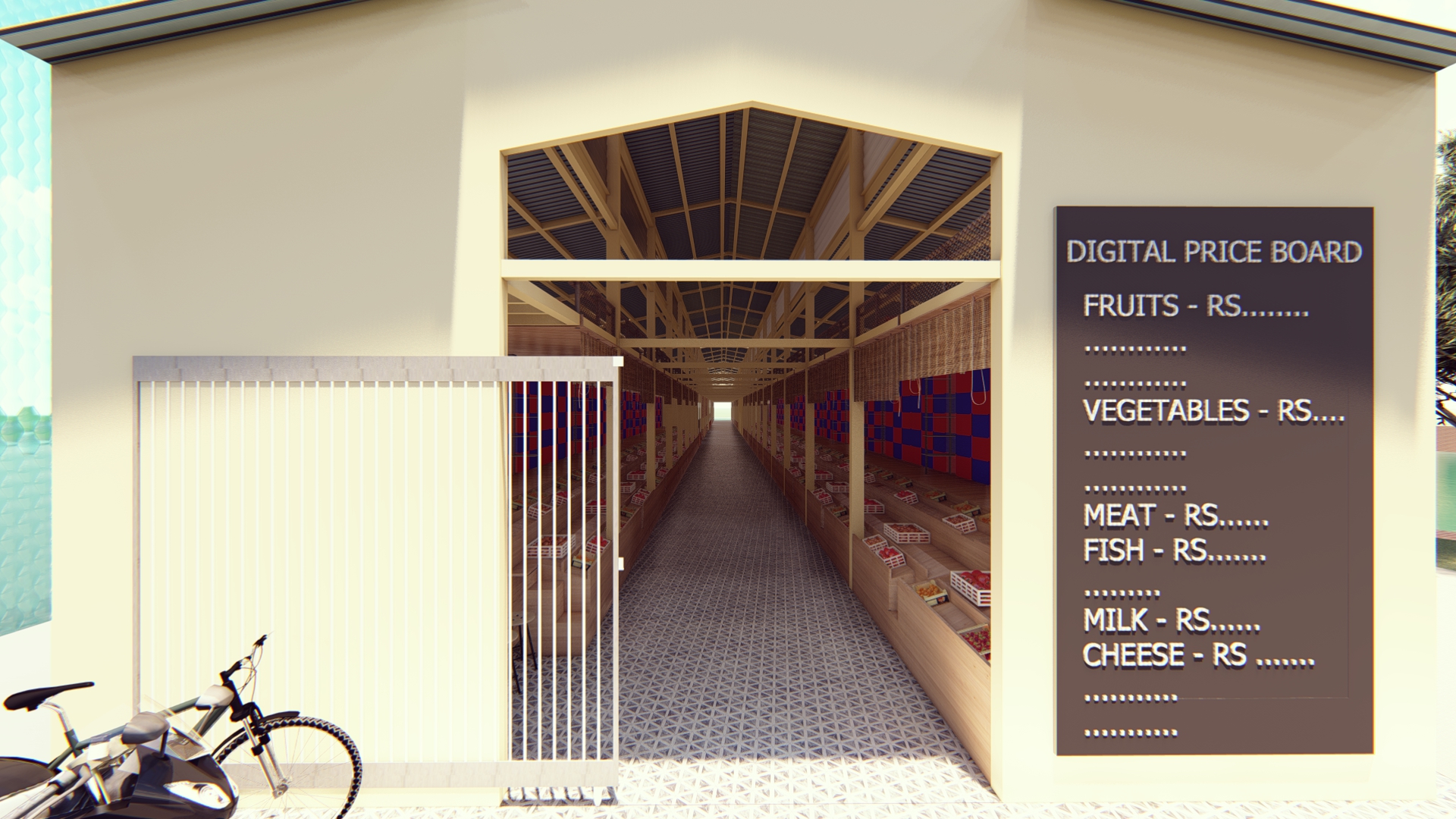 The marketplace is thoughtfully divided into zones, each catering to specific product categories such as vegetables, fruits, meat, dairy products, and the food court. This segmentation optimizes vendor placement and customer navigation, enhancing the overall shopping experience.