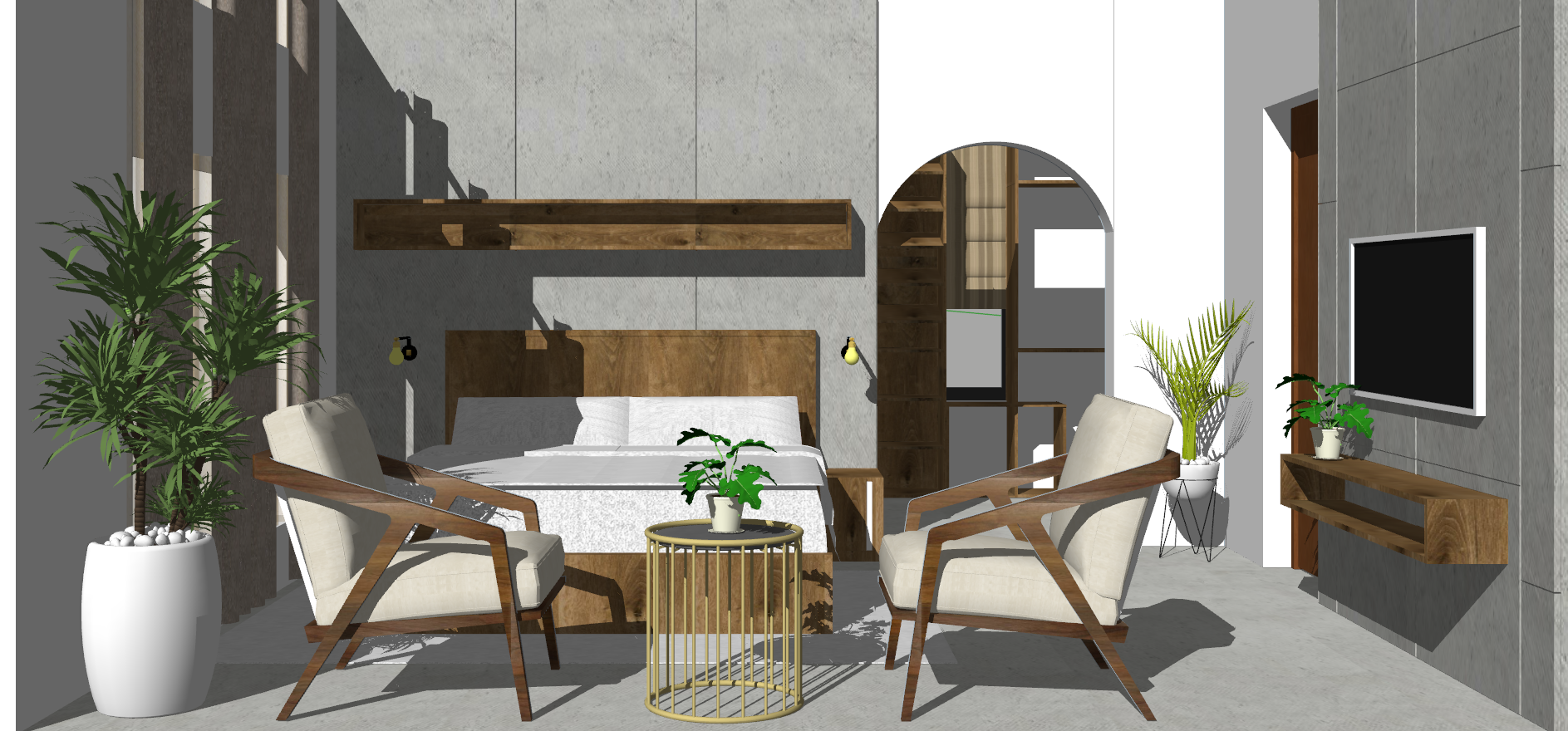 This project involved designing interiors for client Akshun Thapa’s new family flat spanning a living room, bedroom, gym, and common areas. The goal was creating a contemporary, minimalist look reflecting the client’s lifestyle.The color palette centers on whites and natural wood tones to impart an airy, relaxed sensibility throughout the spaces. Clean lines, ample lighting, and lots of negative space enhance the modern aesthetic. The living room features a statement wood slat accent wall and modular sofa. The nearby gym incorporates mirrored walls and sleek rubber flooring for functionality. The master bedroom balances warmth through wood nightstands and cozy textiles with low-profile platform bed frames. Careful space planning optimized room layouts while allowing seamless flow between areas.